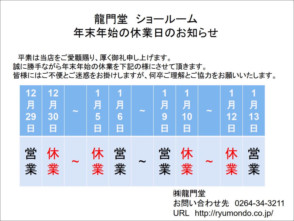 年末年始の休業日のお知らせ