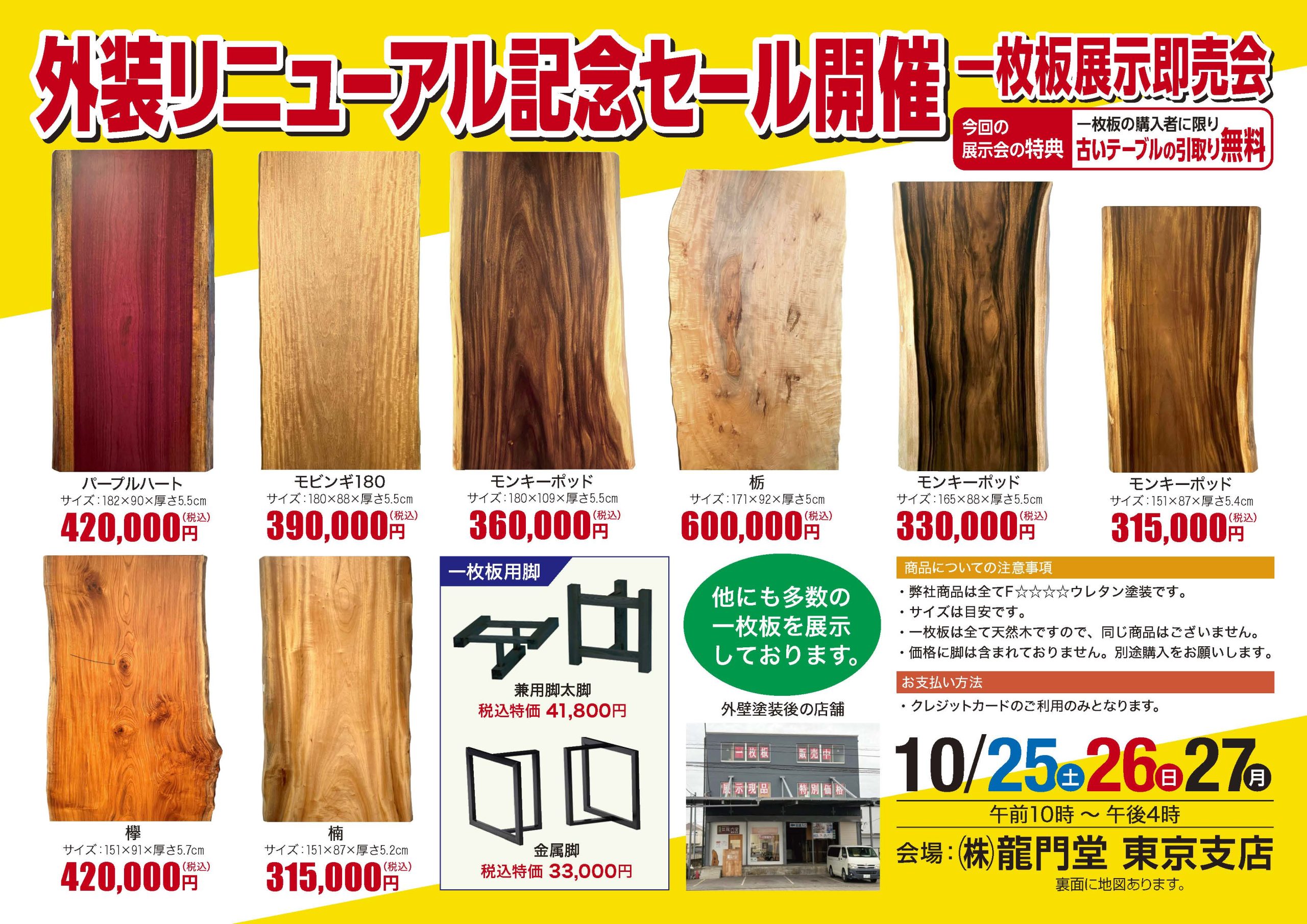 また、無垢一枚板の魅力をよりお気軽にご覧いただくために年に数回、展示即売会を実施しております。普段は見ることが出来ない人気柄や希少柄等を特別価格にてご提供しますので開催時にはお気軽にお立ち寄りください。
