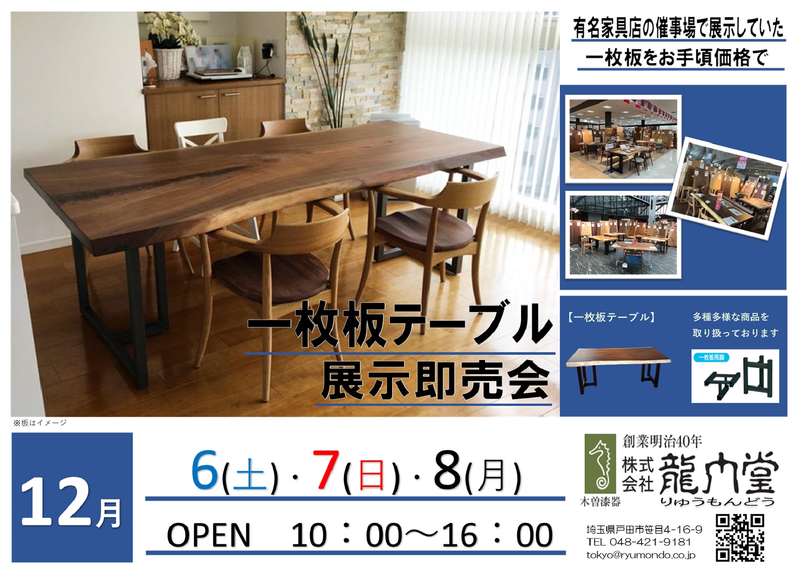 また、無垢一枚板の魅力をよりお気軽にご覧いただくために年に数回、展示即売会を実施しております。普段は見ることが出来ない人気柄や希少柄等を特別価格にてご提供しますので開催時にはお気軽にお立ち寄りください。