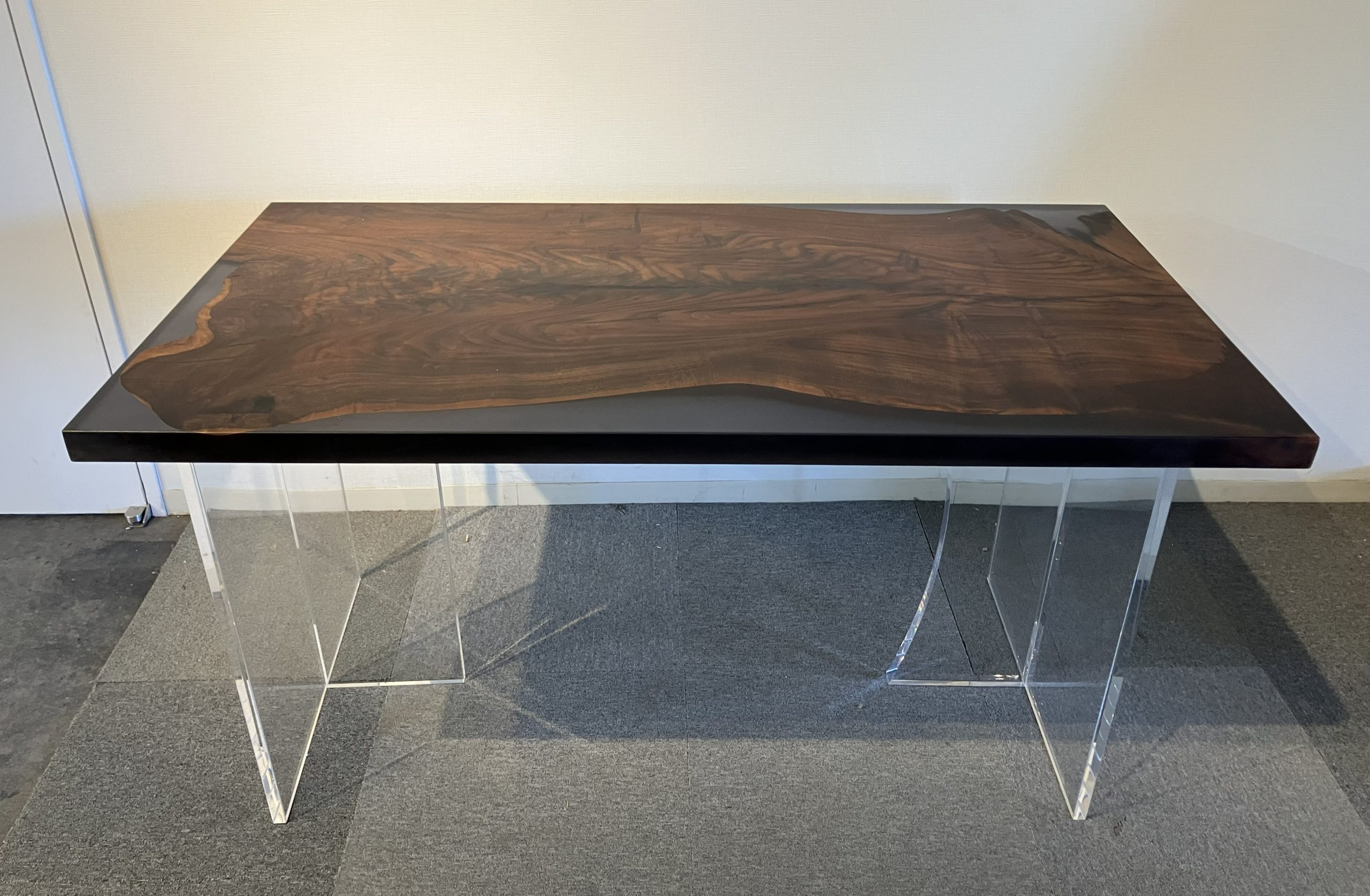 ウォールナット・レジンテーブルは、天然木とエポキシレジン(樹脂)を組み合わせたテーブルは、従来の家具にはないアート性と個性を持ち、多くの人を魅了しています。アクリル脚との組み合わせは、モダンでスタイリッシュな印象を与え、洗練された空間へと変化させます。