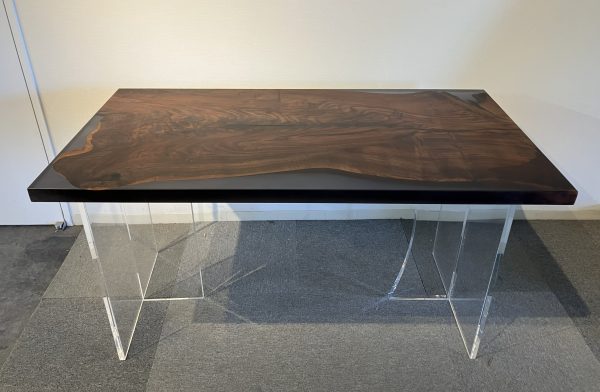 ウォールナット・レジンテーブルは、天然木が持つ自然の力強さと、レジンがもたらす透明感を融合させた、唯一無二の家具です。天然木とエポキシレジン(樹脂)を組み合わせたこのテーブルは、従来の家具にはないアート性と個性を持ち、多くの人を魅了しています。アクリル脚との組み合わせは、モダンでスタイリッシュな印象を与え、洗練された空間へと変化させます。杢目は見る角度で大きく変化します。