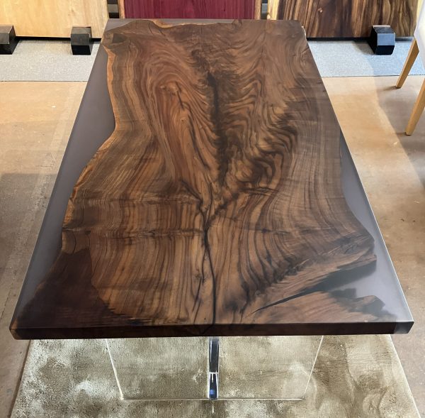 ウォールナット・レジンテーブルは、天然木が持つ自然の力強さと、レジンがもたらす透明感を融合させた、唯一無二の家具です。天然木とエポキシレジン(樹脂)を組み合わせたこのテーブルは、従来の家具にはないアート性と個性を持ち、多くの人を魅了しています。アクリル脚との組み合わせは、モダンでスタイリッシュな印象を与え、洗練された空間へと変化させます。杢目は見る角度で大きく変化します。