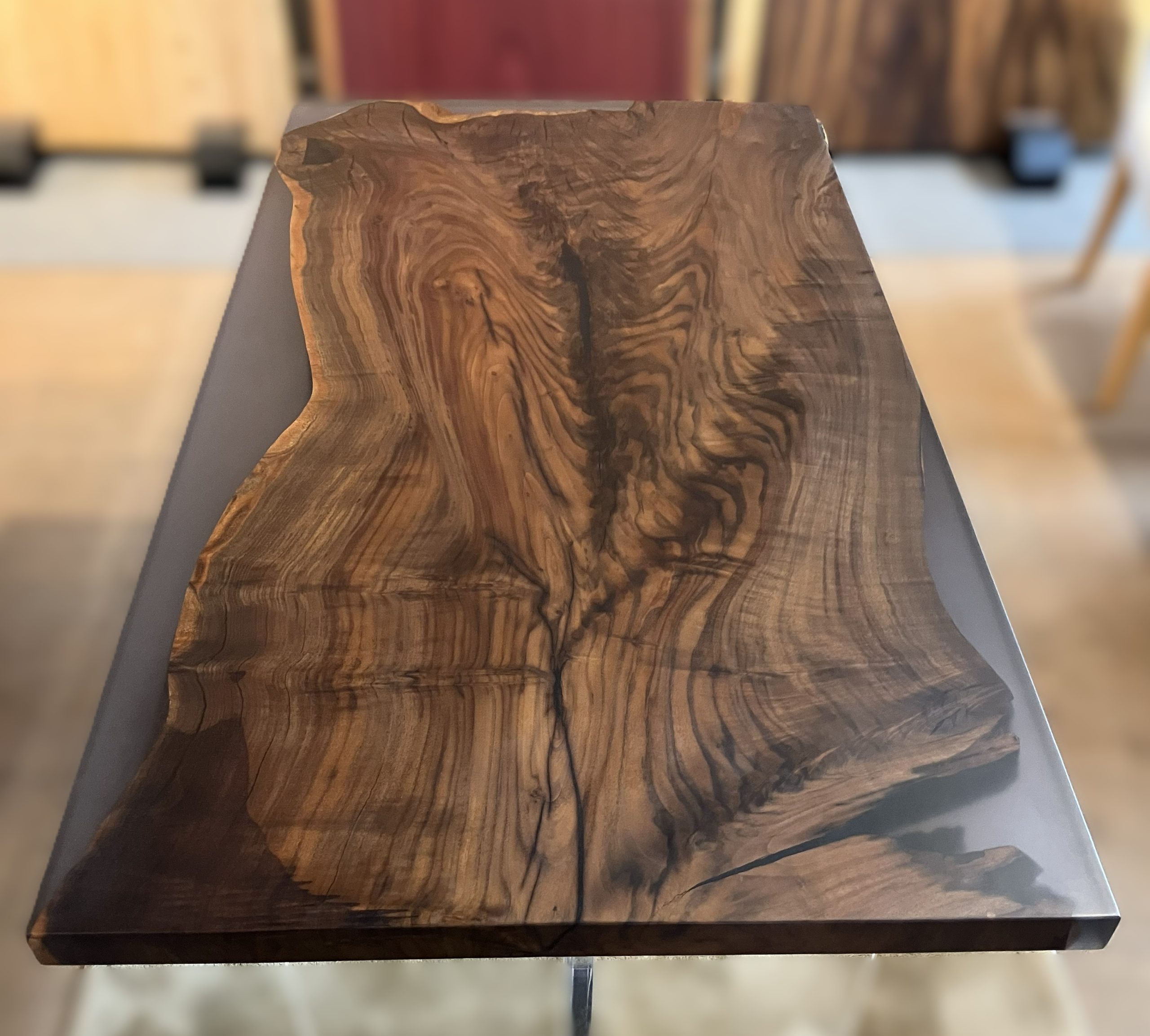 ウォールナット・レジンテーブルは、天然木とエポキシレジン(樹脂)を組み合わせたテーブルは、従来の家具にはないアート性と個性を持ち、多くの人を魅了しています。アクリル脚との組み合わせは、モダンでスタイリッシュな印象を与え、洗練された空間へと変化させます。
